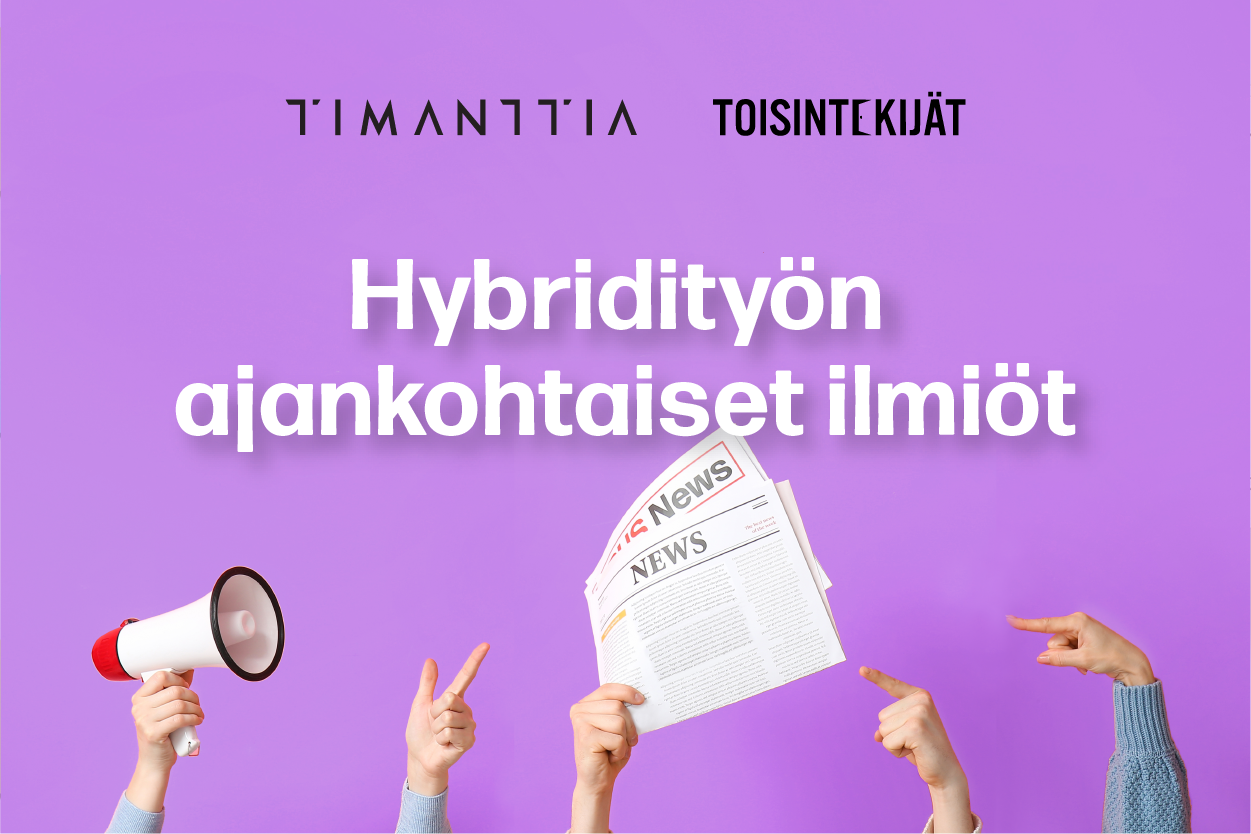 Kaipaatko uusia ajatuksia ja inspiraatioita hybridityöskentelyn järjestämiseen, johtamiseen tai kehittämiseen? Timanttia ja Toisintekijät järjestävät yhteisen maksuttoman stream-webinaarin, jossa kumotaan hybridityön harhaluuloja. Webinaarissa käsitellään hybridityöhön liittyviä väittämiä, jotka nousevat esille tällä hetkellä henkilöstön kokemuksina ja tunteina niin valmennuksissa kuin työnohjauksessa.